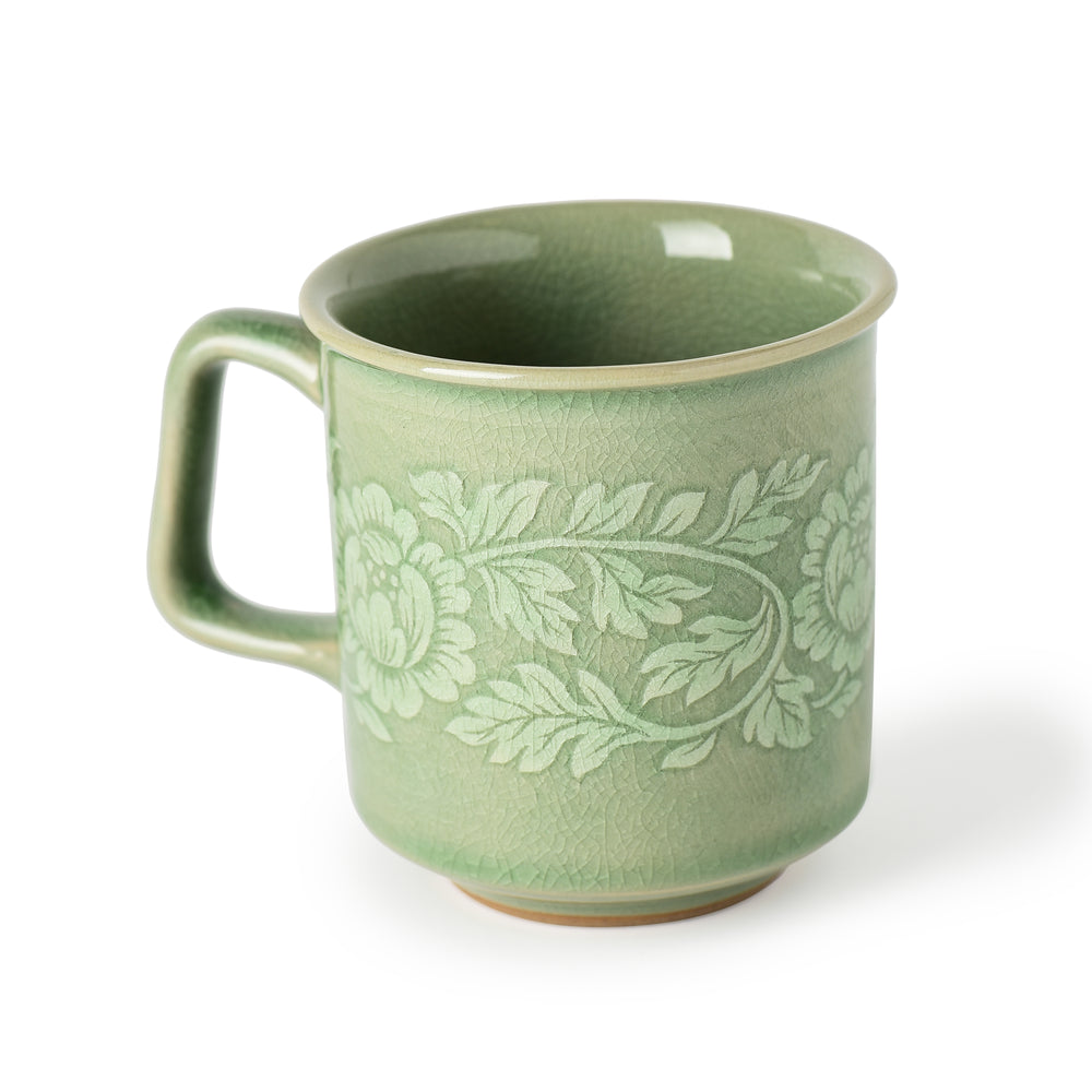 The mug exhibits a fine crackled glaze, which is a characteristic feature of celadon ware.