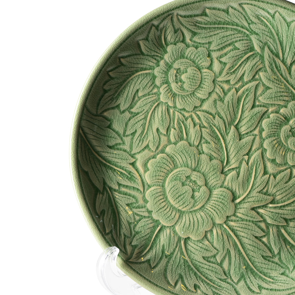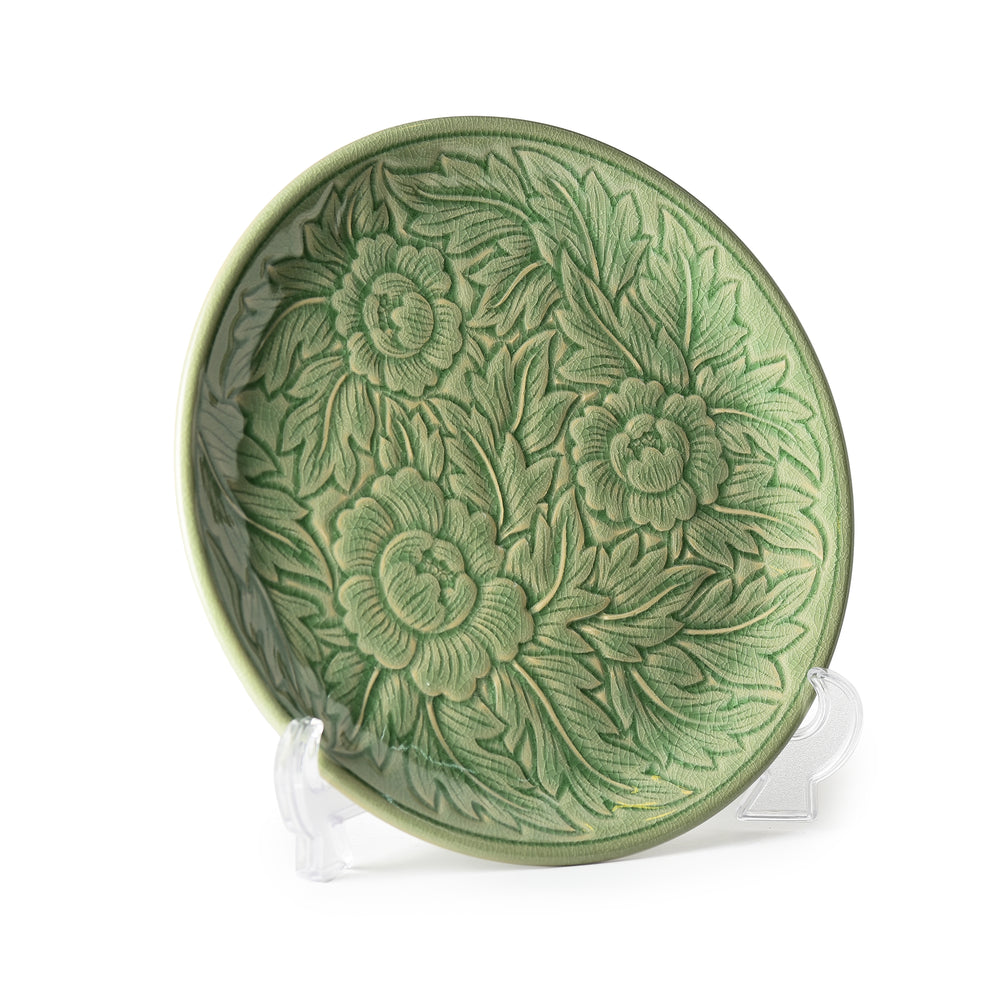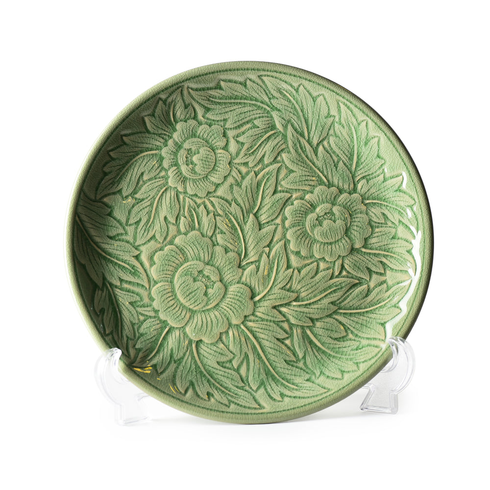 ‘Botan’ in Thai is the peony flower which signifies luxury, prosperity and good fortune. The hand carved plate with its bas-relief of symmetrical design of flowers and leaves creates a textured ornamental effect.