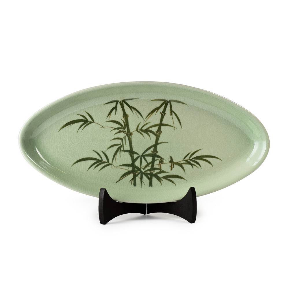This oblong hand painted celadon plate features a minimalist yet elegant design centred around a bamboo motif. The natural and flowing arrangement of the motif captures the essence of bamboo.