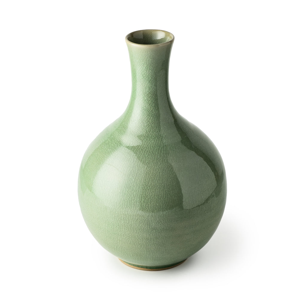 The celadon vase features a classic shape with a rounded, bulbous body that tapers upwards into a slender neck and a slightly flared rim. The vase with its distinctive crackled glaze and jade-like hue exhibits understated elegance and refinement.