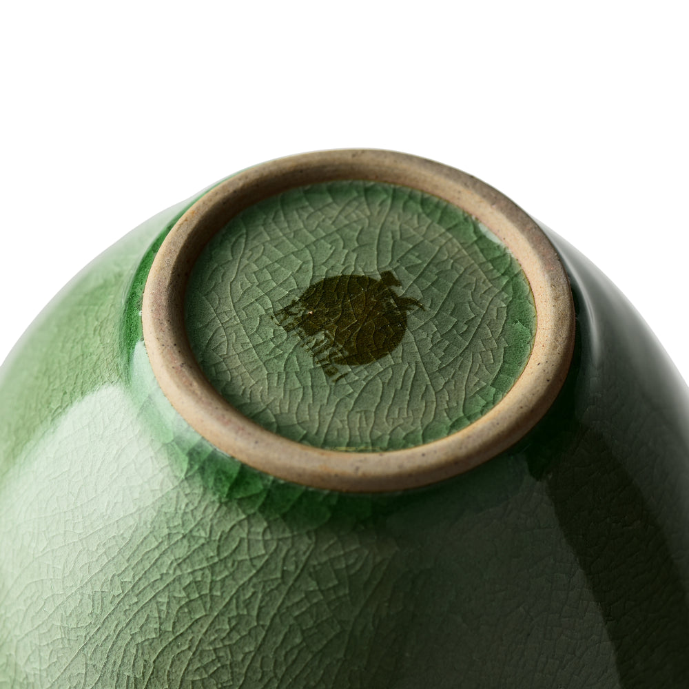 The celadon vase features a classic, elegant globular design tapering towards a narrower neck and a slightly flared rim. The vase with its distinctive crackled glaze and jade-like hue exhibits understated elegance and refinement.