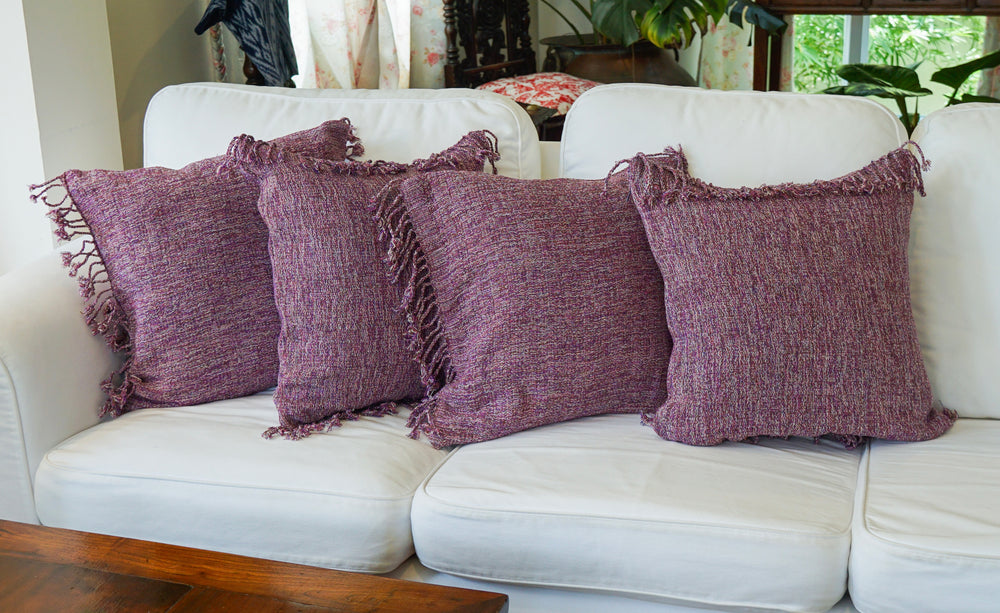 This classic handwoven cushion cover sourced directly from the Karen community of northern Thailand offers a blend of soothing colours. The cushion cover with its comforting texture and playful tassles is perfect for adding comfort and sophistication to your décor.