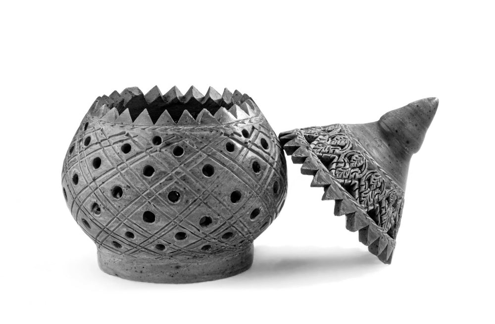 The cleverly crafted two pieces fit together only at one place. Clay mixed with plant husks gives it the unglazed charcoal finish.