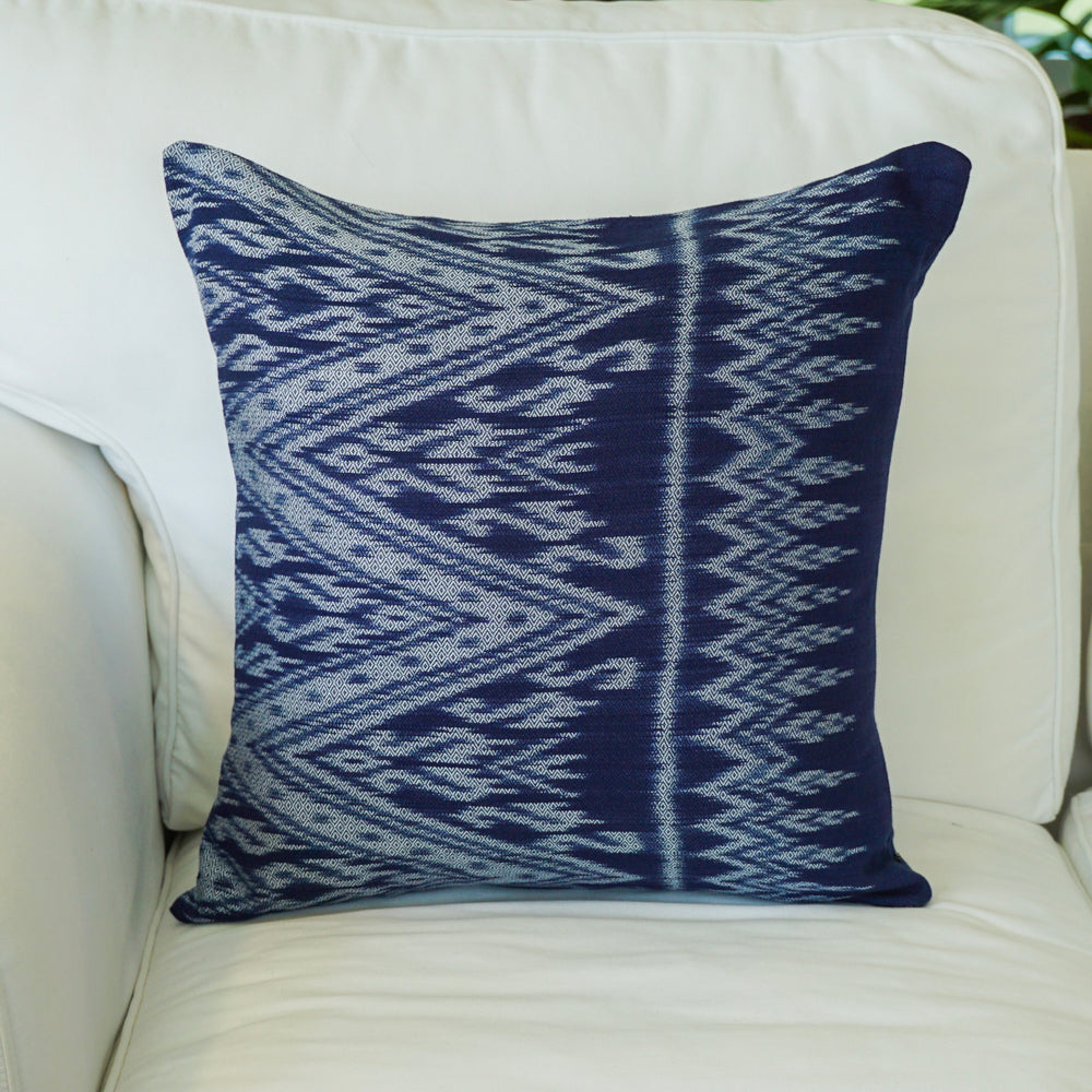 This classic handwoven cushion cover sourced directly from the Karen community in north-eastern Thailand is made of material which is crafted through manual processes that involves hand spinning the fibres into yarn with hand spindle, hand dyeing it with natural indigo and weaving the fabric on a foot treadle loom. The ‘khor’ design consists of geometric hooks, diamonds and zigzag patterns which are created by the weft technique in which extra threads are inserted to create the pattern. This cushion cover with its timeless and elegant design will be an epitome of versatile elegance in your décor.