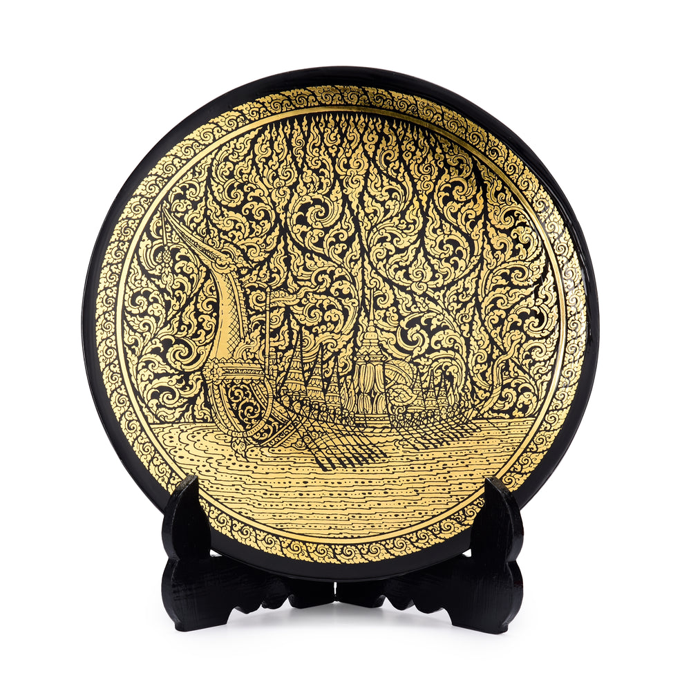 This fine black lacquered show plate with gold leaf gilding depicts the royal barge, ‘Suphannahong’, considered the most important and most elegant vessel in the royal barge procession. The design of the piece depicts traditional Thai art motifs like stylized foliage and floral patterns.