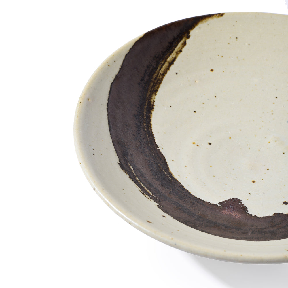 This work of art is created by renowned Thai artist Somluk Pantiboon who had trained under 13th generation master Karatsu potter, Nakazato Tarouemon in Kyushu, Japan. The classic wheel-thrown plate is characterized by its rustic aesthetic, featuring a light, earthy tone with subtle speckles throughout the glaze, and a distinctive dark, organic swirl pattern on one side. The prominent wave-like swirl creates a dynamic, spontaneous and abstract decorative element. The aesthetically simple work is inspired by the Japanese Mingei tradition. The simplicity of form combined with the energetic brushwork creates a harmonious blend of rusticity and artistic expression.