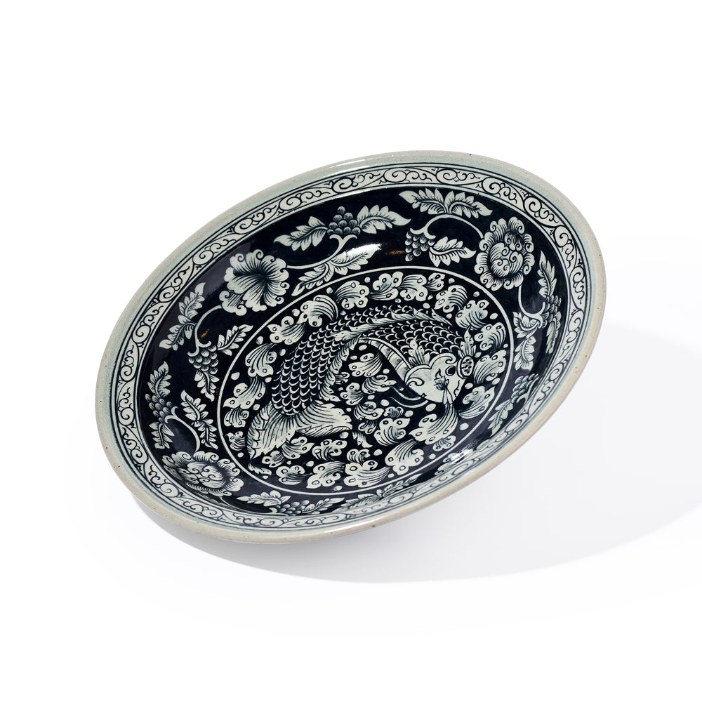 The hand painted decorative display plate features a central monochrome motif of a stylized fish. Around the central figure, the plate is adorned with detailed floral and swirling vine patterns which create a sense of depth and provide contrast. Fish signifies prosperity, good fortune and abundance, and also represents fertility, perseverance and the ability to navigate life’s challenges in Thai culture.